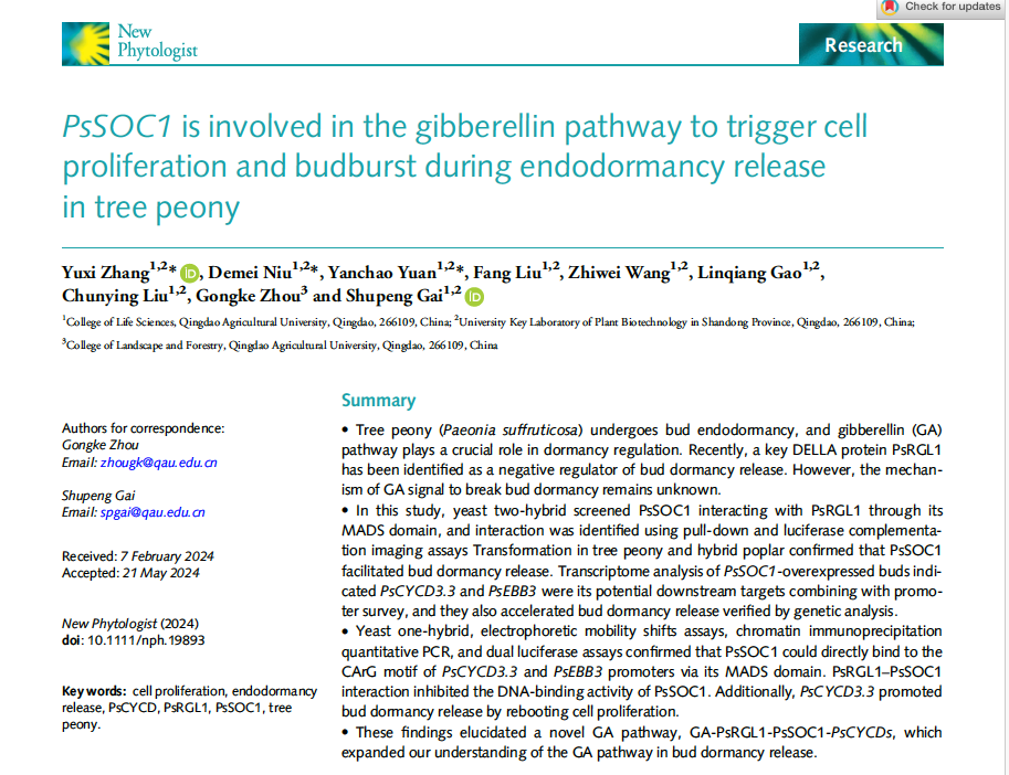 近日,必威西汉姆联盖树鹏、园林与林公司周功克团队合作在New Phytologist上发表了题为“PsSOC1 is involved in the gibberellin pathway to trigger cell proliferation and budburst during endodormancy release in tree peony”的研究论文。该研究发现了一种GA信号的新途径,解析了牡丹PsSOC1作为GA信号的重要组分通过重启细胞周期调控芽休眠解除的分子机制。