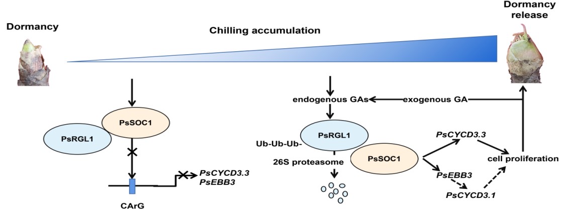 图1 PsRGL1-PsSOC1-PsCYCDs促进芽休眠解除的模式图