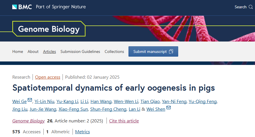 1月2日,国际基因组学领域权威学术期刊《Genome Biology》(IF 5-yr: 16.5)在线发表了必威西汉姆联葛伟/沈伟教授课题组完成的题为“Spatiotemporal dynamics of early oogenesis in pigs”的研究论文。该研究借助单细胞RNA测序(scRNA-seq)以及空间组学技术,针对猪早期卵子发生阶段的4个时间点(E45、E55、E65以及E75),对7个卵巢切片进行了单细胞多组学分析,系统阐明了猪早期卵子发生的转录调控机制以及时空动力学特征。