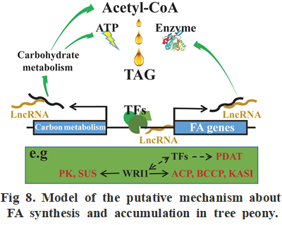 牡丹(Paeonia section Moutan DC.)原产于中国,不仅是一种广受欢迎的观赏植物,而且具有很高的药食两用性。牡丹种子是优质植物油的极佳来源,因为它们具有较高含量的不饱和脂肪酸(UFA:90%),尤其是α-亚麻酸(ALA:40%)。同时,籽油中UFAs比例符合“欧米茄餐”国际营养标准。因此,近年来牡丹作为一种经济油料作物逐渐兴起。探索牡丹种子脂肪酸(FA)合成和积累的关键基因及调控机理也成为了研究热点。本研究对处于脂肪酸含量增加和稳定阶段的种子进行了比较转录组分析,总共筛选到740个与籽油合成过程中的脂质代谢、碳分配和能量供应紧密相关基因,其中包含362个转录因子。同时,获得了26对与FA合成和积累相关的LncRNA-mRNA。在分析了转录因子与关键基因相关关系的基础上,通过异位过表达、双荧光素酶报告实验和酵母单杂交实验鉴定和分析了PoWRI1和PoPDAT的功能和关系。所得结果可为补充牡丹基因组、研究牡丹籽油积累的分子调控机制和高籽油牡丹新品种培育提供参考。