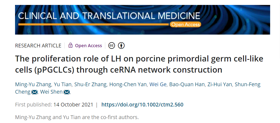 近日,必威西汉姆联沈伟教授课题组在中科院一区、TOP期刊《Clinical and Translational Medicine》(IF=11.492)上发表研究论文“The proliferation role of LH on porcine primordial germ cell-like cells through ceRNA network construction”,首次揭示了促黄体生成素促进猪皮肤来源干细胞体外分化的原始生殖细胞样细胞增殖的分子调节机制。公司硕士研究生张明玉和田宇为该论文并列第一作者,沈伟教授与程顺峰教授为该论文共同通讯作者,必威西汉姆联为第一和通讯作者单位。