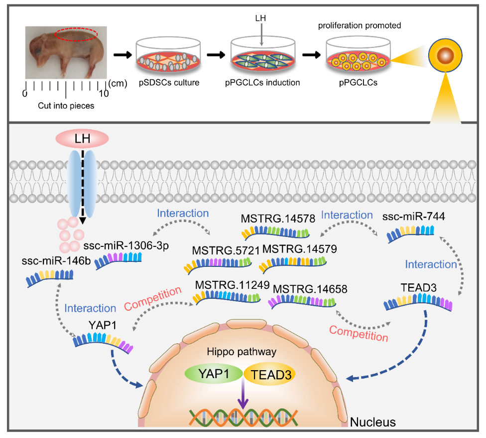 沈伟教授课题组以猪作为研究对象,分离纯化猪SDSCs,并将其体外转分化成PGCLCs。研究发现,促黄体生成素(LH)可以显著促进猪PGCLCs的体外增殖。通过对PGCLCs进行全转录组测序分析及实验验证发现,LH使非编码RNA中的ssc-miR-146b、ssc-miR-744和ssc-miR-1306-3p表达水平下调,MSTRG.14578、MSTRG.14658、MSTRG.14579、MSTRG.11249、MSTRG.5721以及转录调控因子YAP1和TEAD3表达水平上调,激活了Hippo信号通路,从而促进了猪PGCLCs增殖。该研究借助结合位点预测分析与体外靶向关系验证试验等进一步构建了ceRNA调控网络,系统地阐明了LH通过ceRNA网络介导的Hippo信号通路在PGCLCs体外增殖中的作用途径和分子机制。