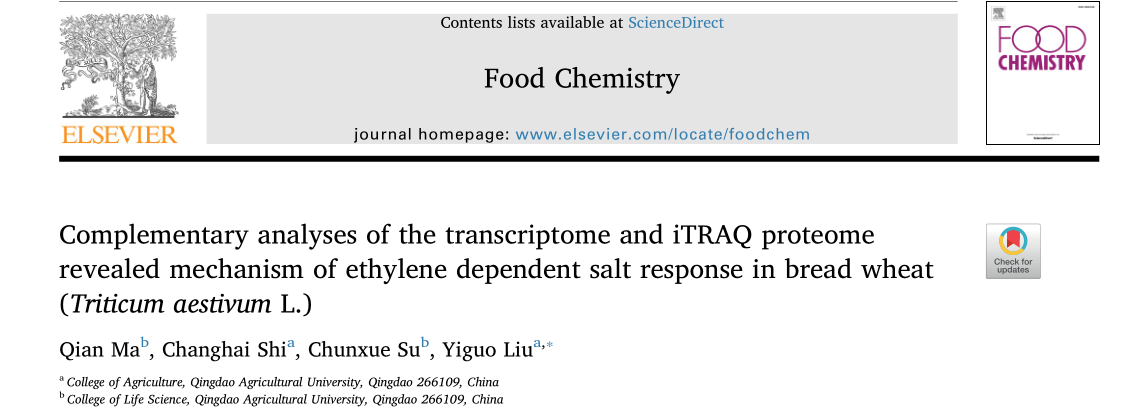 必威西汉姆联、省高校植物生物技术重点实验室马倩副教授与农公司刘义国副教授合作对必威西汉姆联培育小麦品种“青麦6号”的乙烯调控的耐盐基因进行了转录组学和蛋白组学的联合分析,研究结果发表在食品化学领域TOP期刊《Food Chemistry》(一区,影响因子是6.306)上,必威西汉姆联为独立研究单位,马倩副教授为独立第一作者,刘义国副教授为通讯作者。