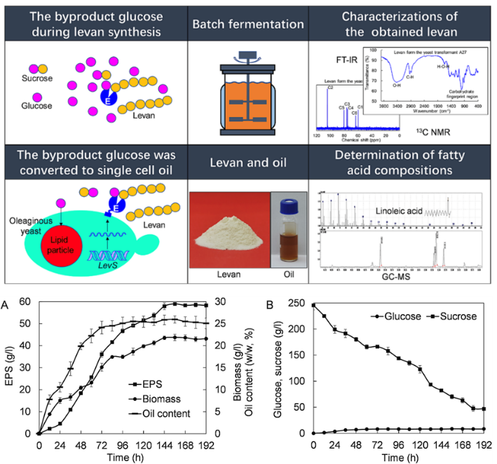 对此,课题组利用葡萄糖杆菌来源的LevS基因构建了工程化解脂耶氏酵母菌株。解脂耶氏酵母是一种公认安全、高产能的油脂酵母。测试发现,在5升发酵罐中,工程化酵母菌株经156小时培养后,有81.2%的蔗糖被酶解利用,同时合成了58.9 g/L的Levan果聚糖。整个发酵过程中,发酵液中的葡萄糖始终保持在较低水平(小于8.5 g/L),这表明副产物确实得到了有效利用。最终这些发酵副产物被转化成了21.8 g/L的细胞,这些细胞中的油脂含量达到了25.5% (w/w)。