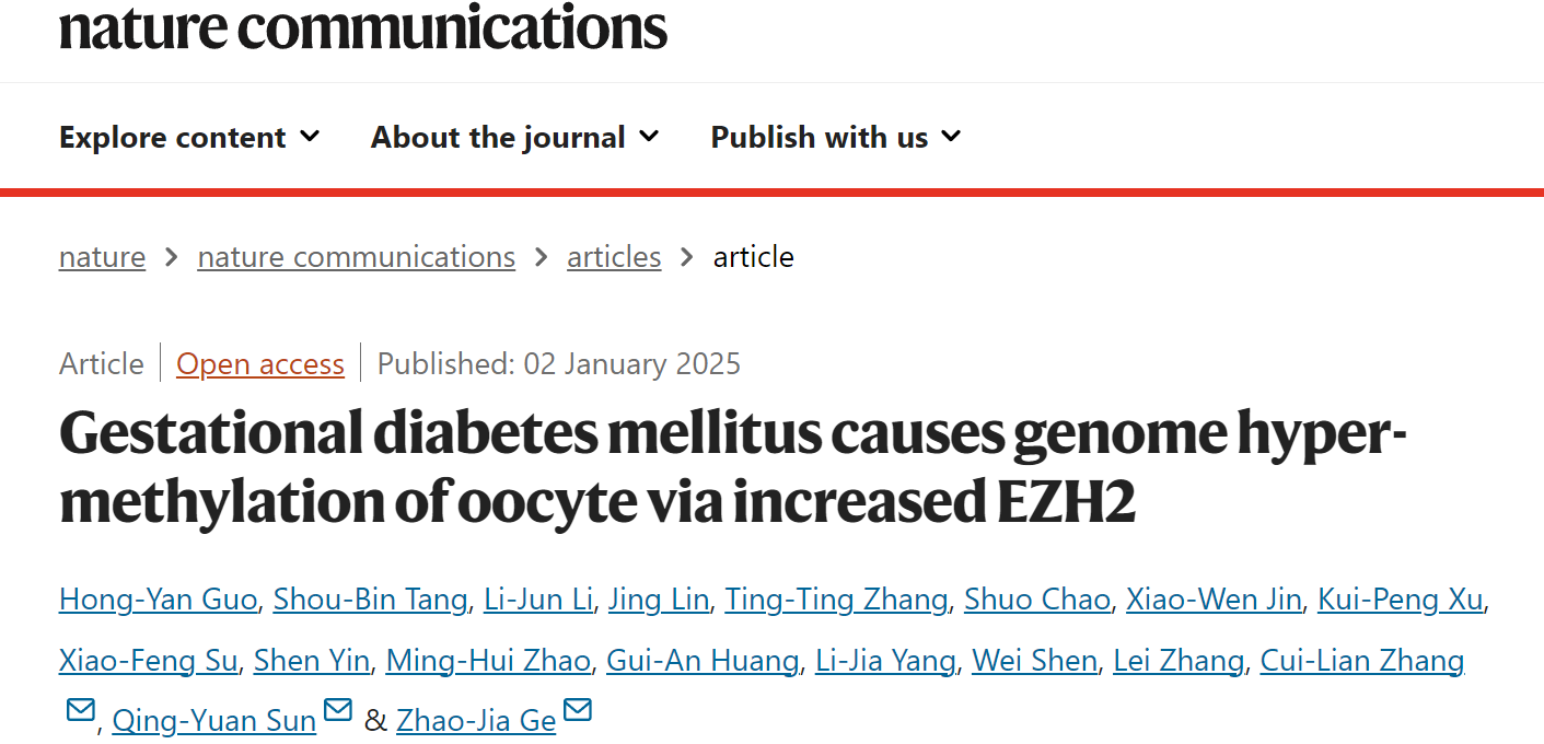 近日,必威西汉姆联葛照嘉教授团队、广东省第二人民医院孙青原教授团队和河南省人民医院生殖中心张翠莲教授团队合作,在Nature Communications杂志发表题为Gestational diabetes mellitus causes genome hyper-methylation of oocyte via increased EZH2的研究论文,揭示了妊娠糖尿病引起子代卵子EZH2基因高表达,通过募集DNA甲基转移酶DNMT1入核介导卵母细胞高甲基化,从而造成后代代谢异常的跨代遗传效应。