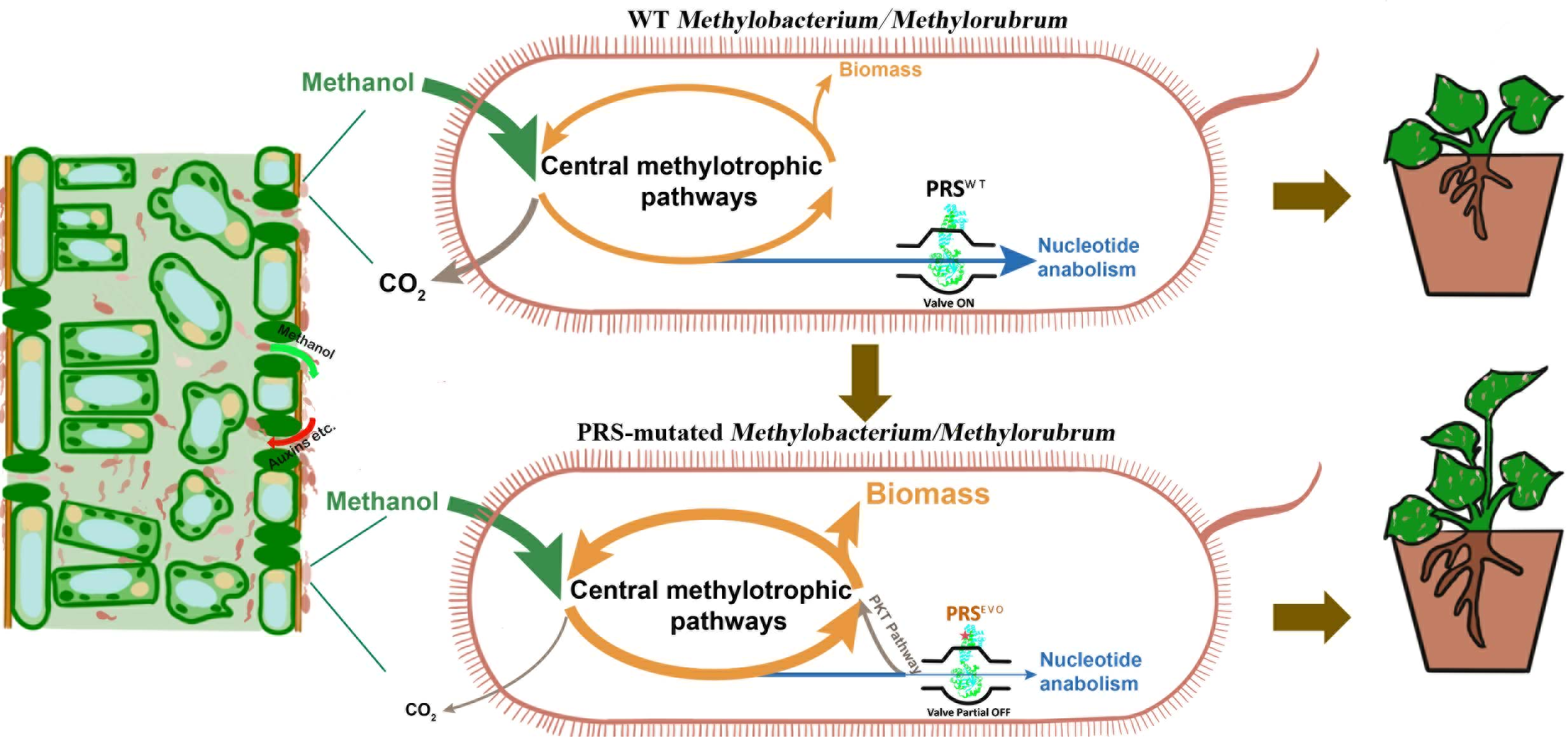 甲基杆菌是以植物叶际释放的甲醇及多碳物质作为生长碳源和能源的植物益生菌,然而叶际生态位碳资源稀缺且波动,阻碍了甲基杆菌定殖和促作物生长效果,如何增进甲基杆菌叶际定殖力是亟待解决的一个关键科学问题。近期杨松团队通过细胞底盘设计和进化生物学策略阐释了甲基杆菌一个新颖代谢调控阀,即磷酸核糖焦磷酸合成酶(Phosphoribosylpyrophosphate synthetase,PRS),在甲基杆菌中心代谢和细胞生长之间建立了新代谢关联。该代谢阀调控了甲基杆菌核苷酸合成代谢与甲醇同化代谢的通量平衡,定向突变磷酸核糖焦磷酸合成酶,增强了寡浓度甲醇转化成细胞生物量得率,减少二氧化碳外排。获得的甲基杆菌突变株增强了植物叶际定殖力,显著促进油菜、黄瓜、甜瓜等多种作物生长和产量。