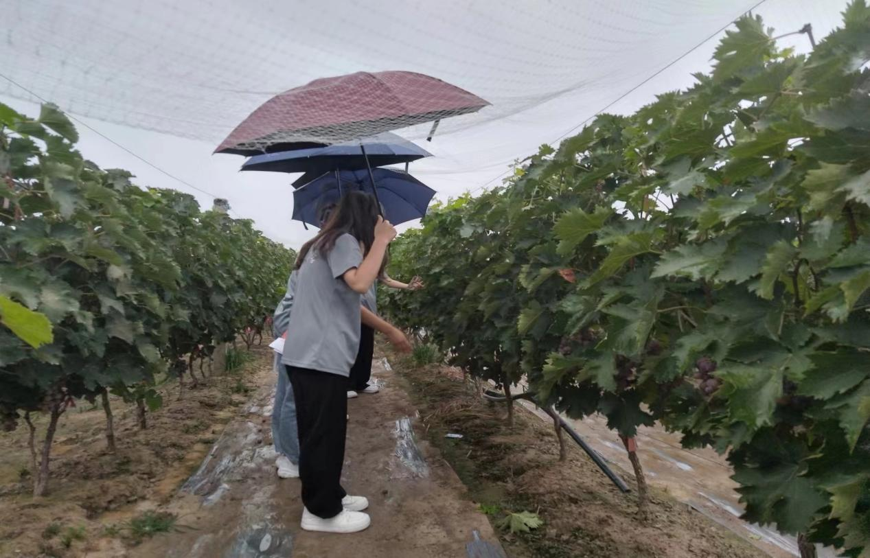 最后,实践队还参观了七一社区的乡村特色农业园区。在那里,实践队成员与产业园的工作人员进行了座谈和采访,详细了解了产业园的建设情况、运营情况和企业文化。同时,工作人员也向成员详细介绍了葡萄的栽培、护理以及收获、售卖的流程及注意事项,为植物学方面的学习提供了更易于理解、贴合现实的实践经验。