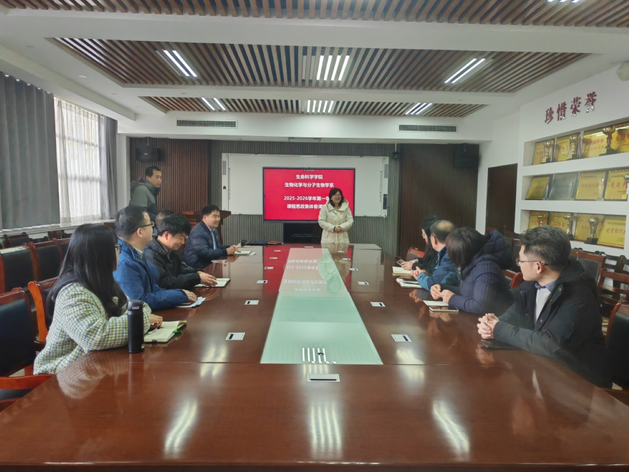 2025年12月10日,生科公司生物化学与分子生物学系在生物楼C305会议室,开展本系2025-2026学年第一学期课程思政集体备课活动。本次会议由生化系主任梁波副教授主持,葛蔚老师作专题汇报,全系骨干教师及团委书记王洋到场观摩。