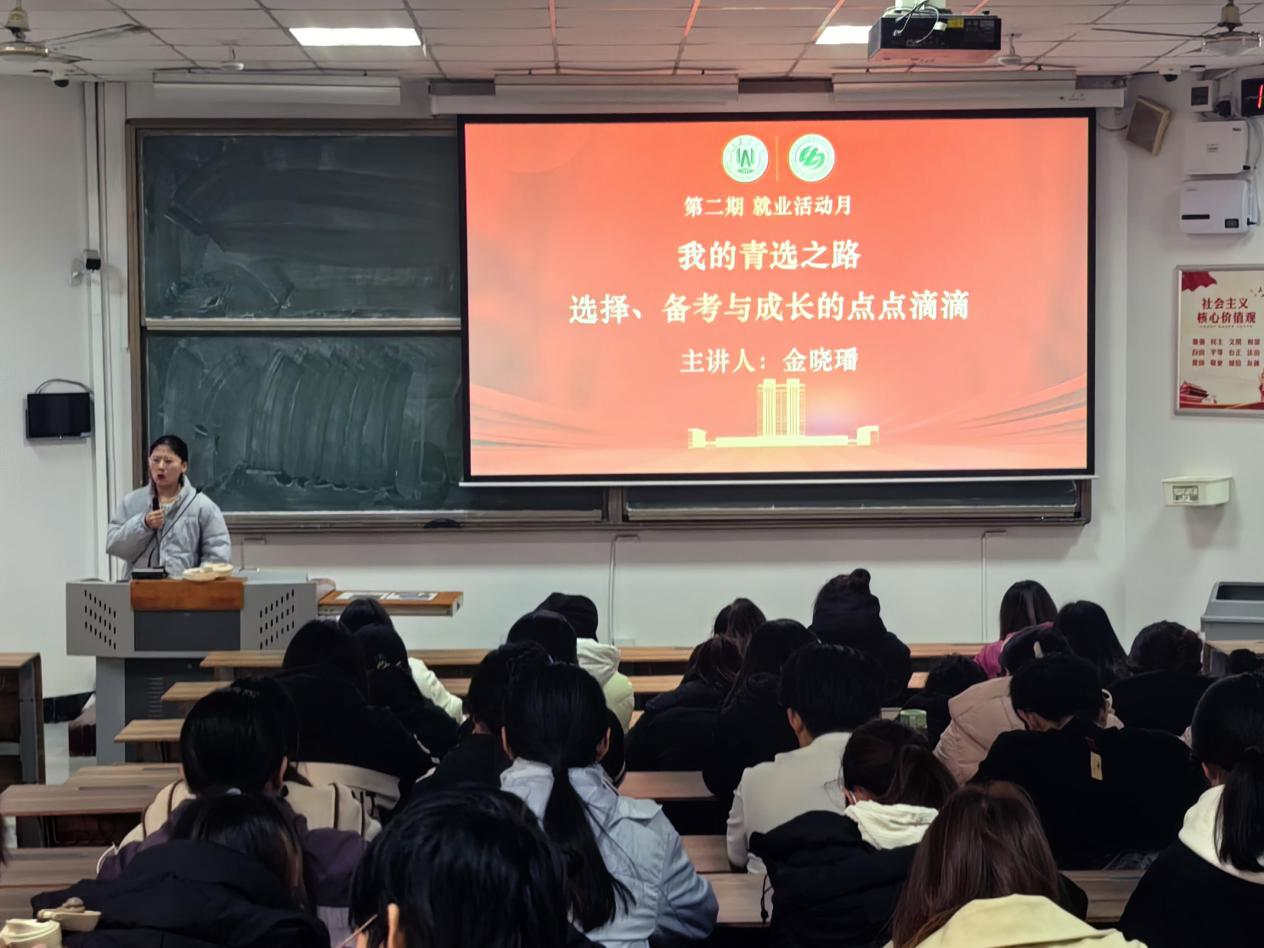 首场报告由现任职于平度市信访局的优秀毕业生金晓璠分享了她的“青选计划”成功经验。她系统介绍了该计划的报考条件、选拔流程,并结合自身工作实例,分享了面试技巧与岗位职责,为同学们提供了客观、全面的报考参考。